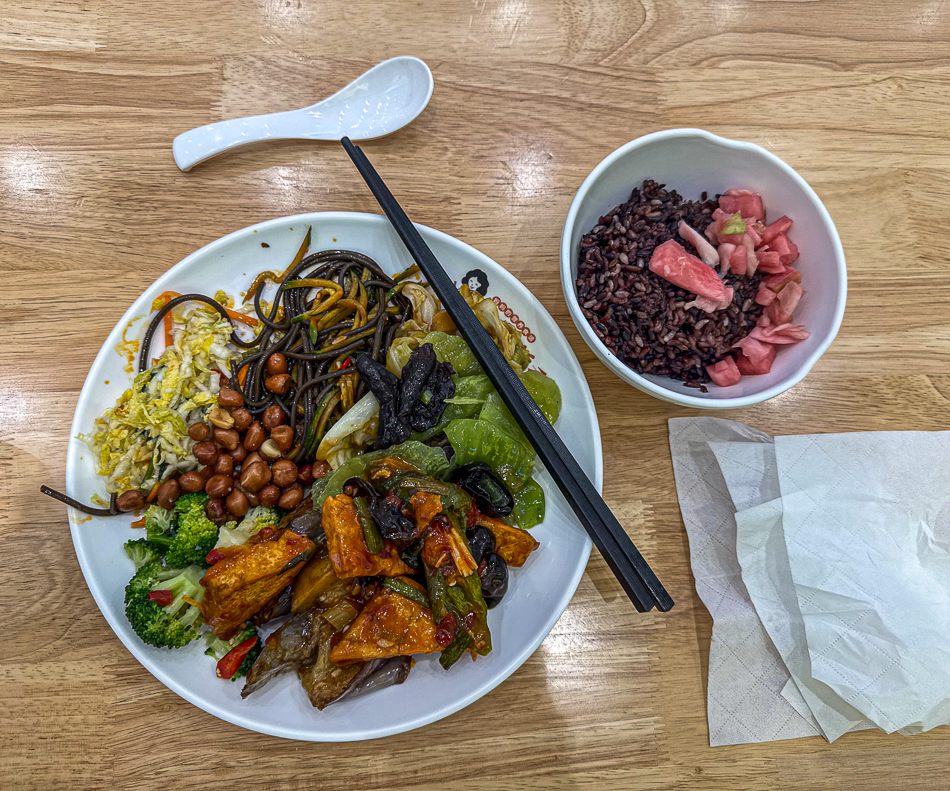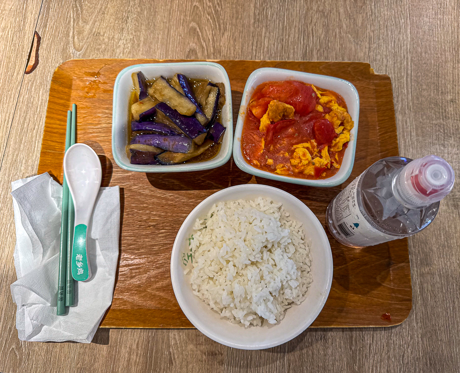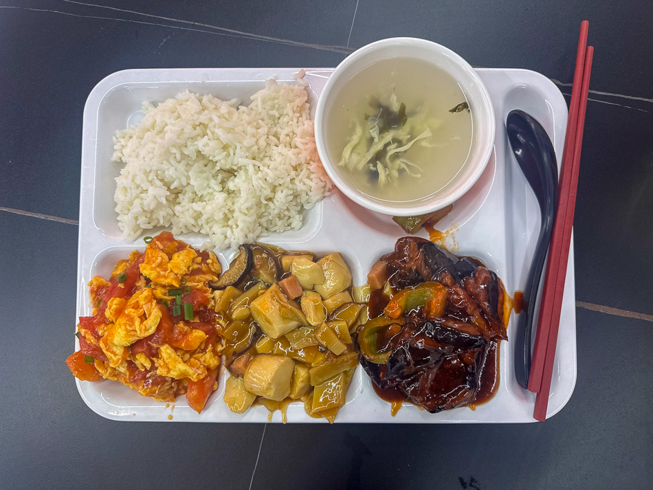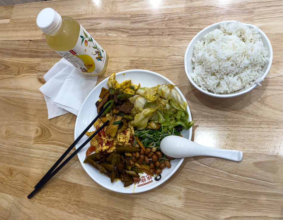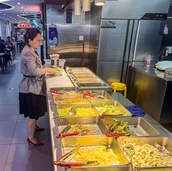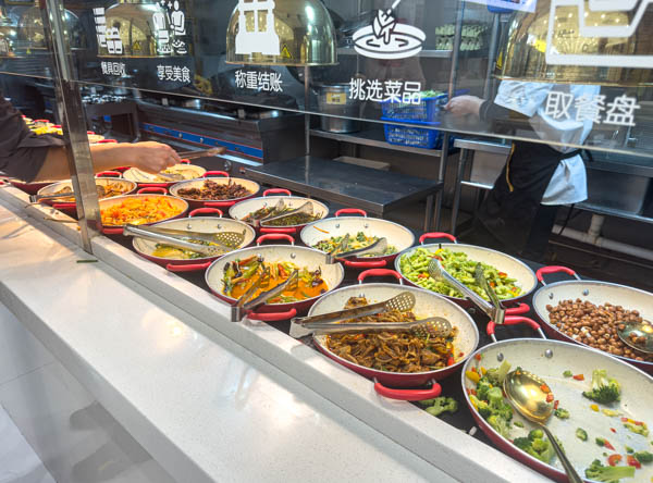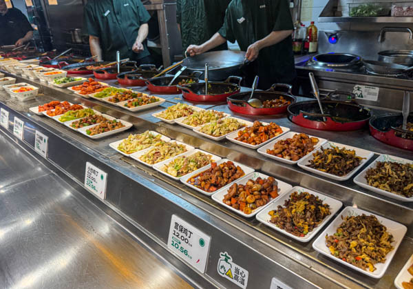 Ces espaces ont été initialement conçus pour les employés des bâtiments du coin. Aux heures de pointe, vers 12h00, ils sont rapidement envahis. C’est pourquoi je préfère habituellement m’y rendre après le départ des employés, généralement entre 13h00 et 14h00. Généralement il reste encore beaucoup de choix et tout est encore chaud et frais. Les cuisiniers et le personnel de service chinois sont à la fois surpris et ravi qu’un étranger » Laowai » comme ils disent ici vienne se restaurer chez eux. Selon l’humeur et l’envie il est possible de choisir tout type de viande ou de volaille, du poissons, nombres de plats chinois ainsi que bien sûr soupes, raviolis et nouilles sautées ou en soupe. Un bol de riz, des patates douces, du maïs ou encore un « Baozi » – petits pains cuits à la vapeur accompagnent généralement les plats.